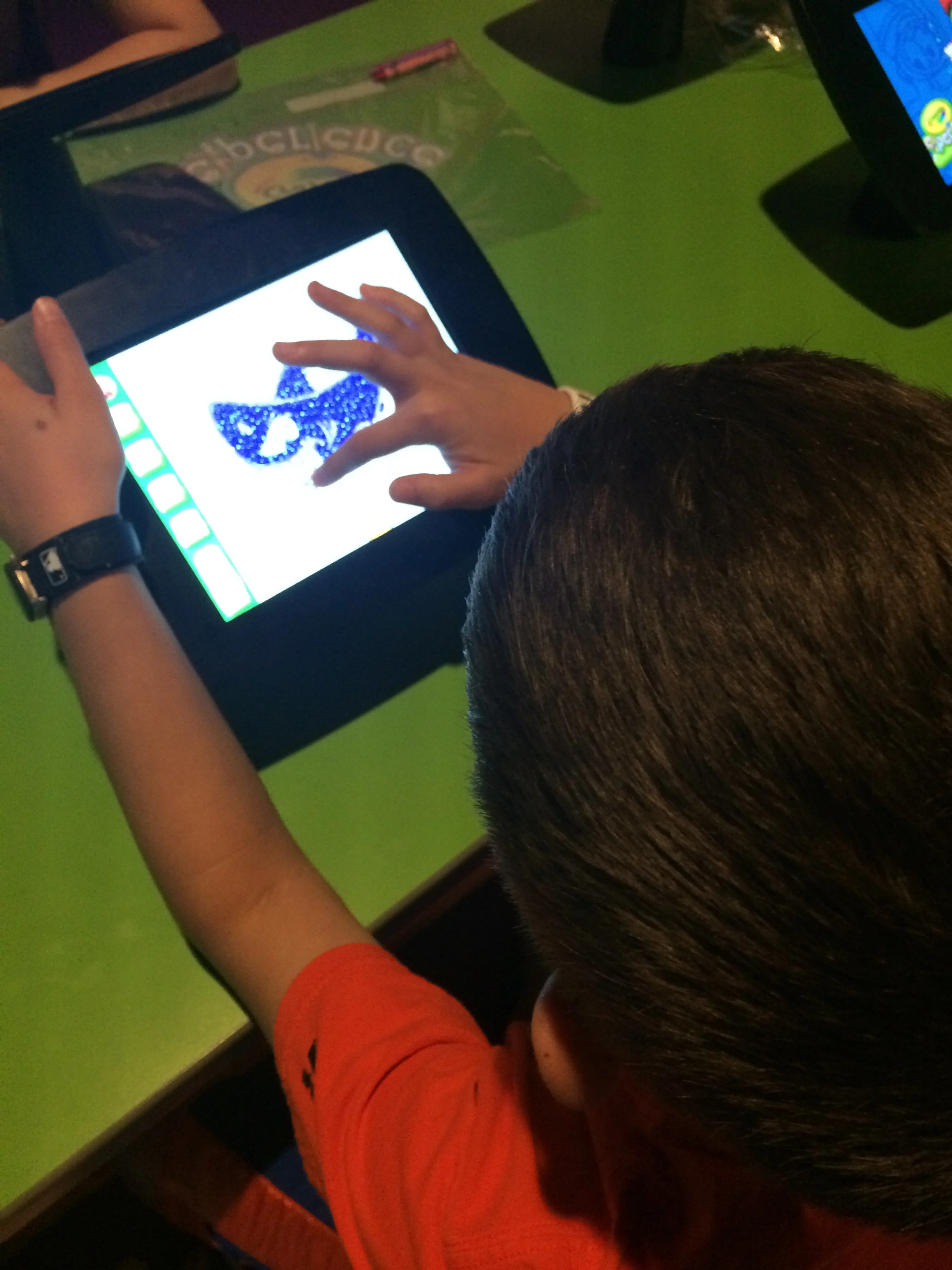 At ART ALIVE you sit at a table full of individual touchscreens and create digital art. You can draw your own image, write a special message or select an image to color in. There are so many fun color options from regular colors to glitter. Next you choose an animation you would like your image to have and then you project it on the wall.