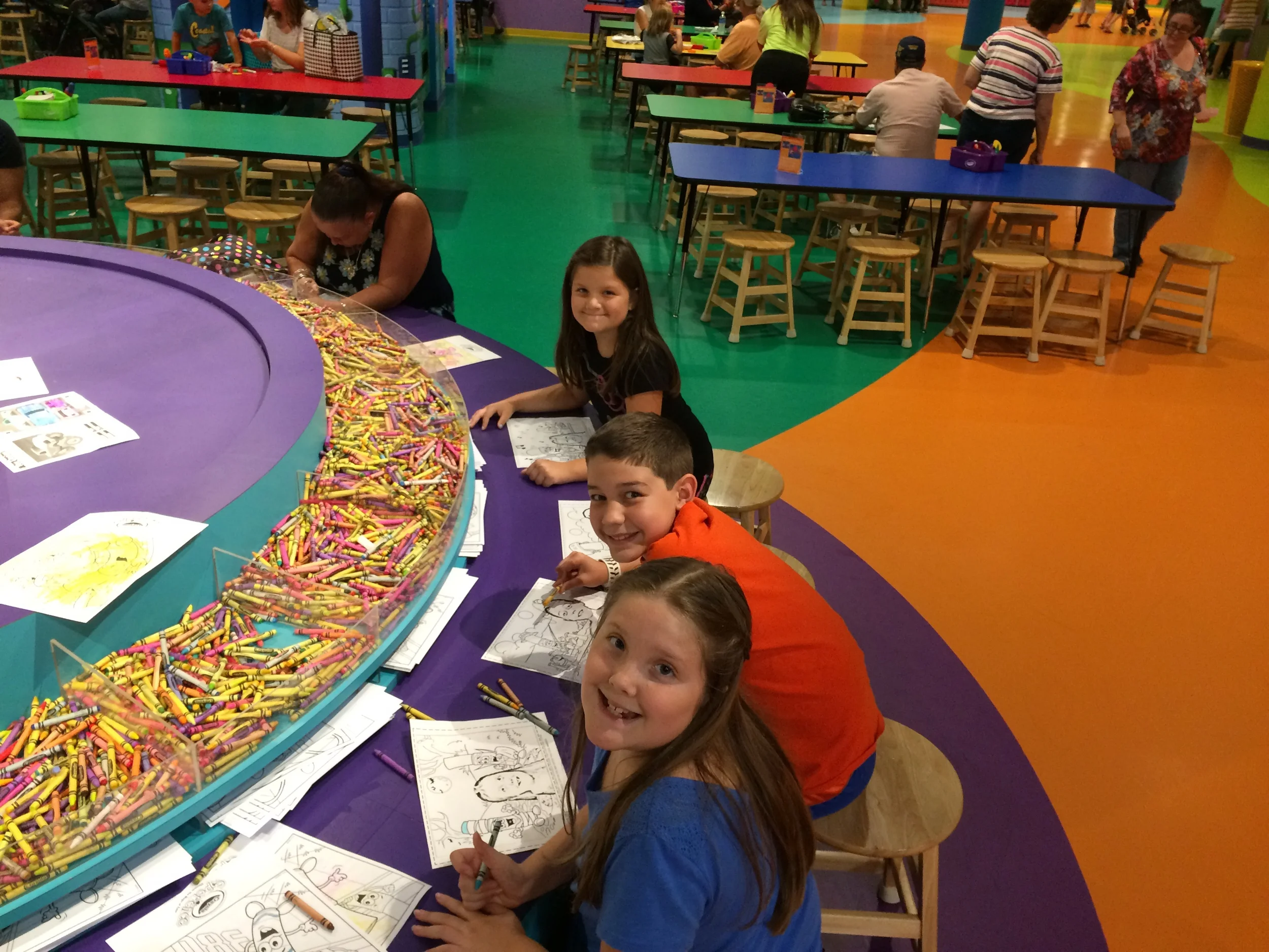 The COLOSSAL CADDY is the epitome of the Crayola Experience! Located on a large round table in the middle of the room. Just pull up a stool and sit at the perfect place to color your creations.