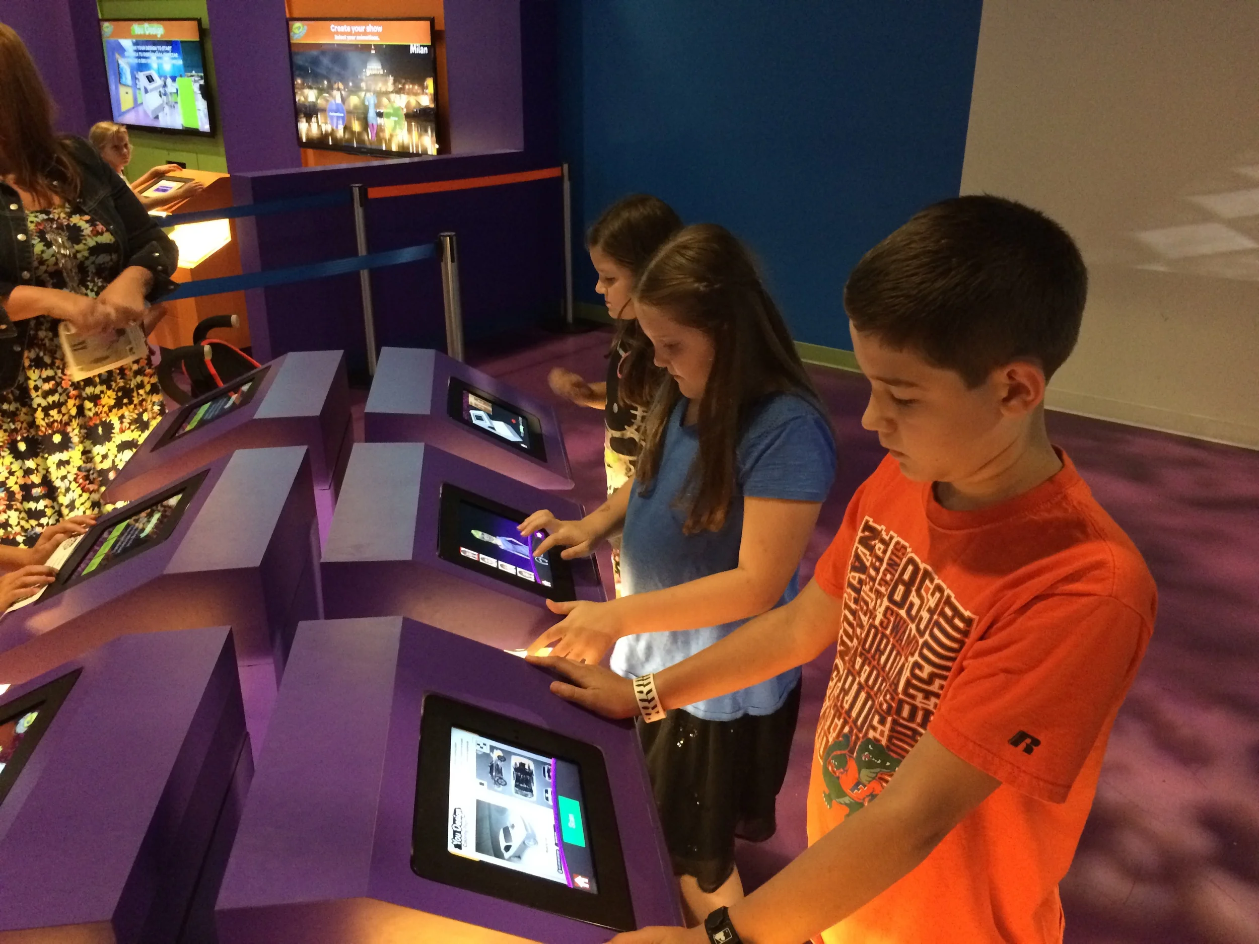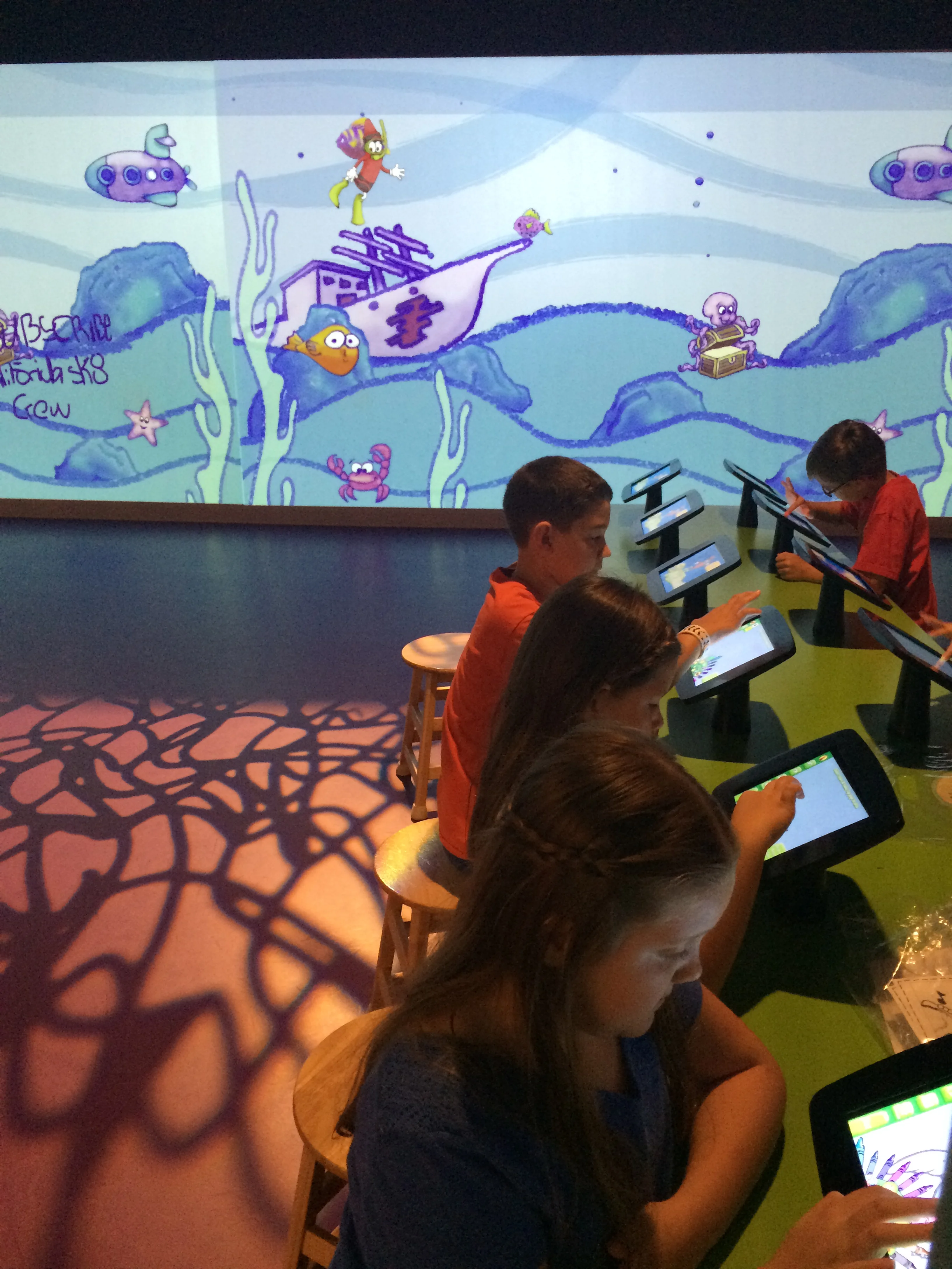 Next, you take your coloring page to the Computer Station with touchscreens and touchmats and press start. No Seats available? No problem just check the back side for more touchscreens!